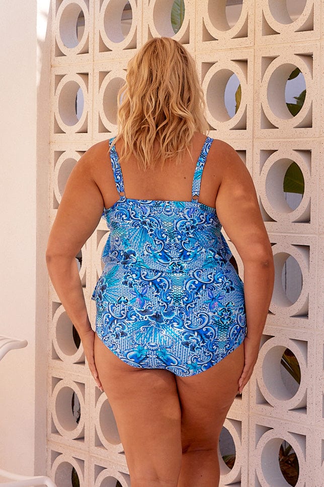 This cleverly designed 3 tier tankini top features a flattering ruffle design and stylish tummy coverage. The Mermaid 3 tier tankini top is a gorgeous style that suits all body types. With a shelf bra that fits and supports up to a G cup, this generous tankini top is a dream to wear. Pair it with the matching Mermaid high waisted bikini bottom for a seamless and stylish summer look.