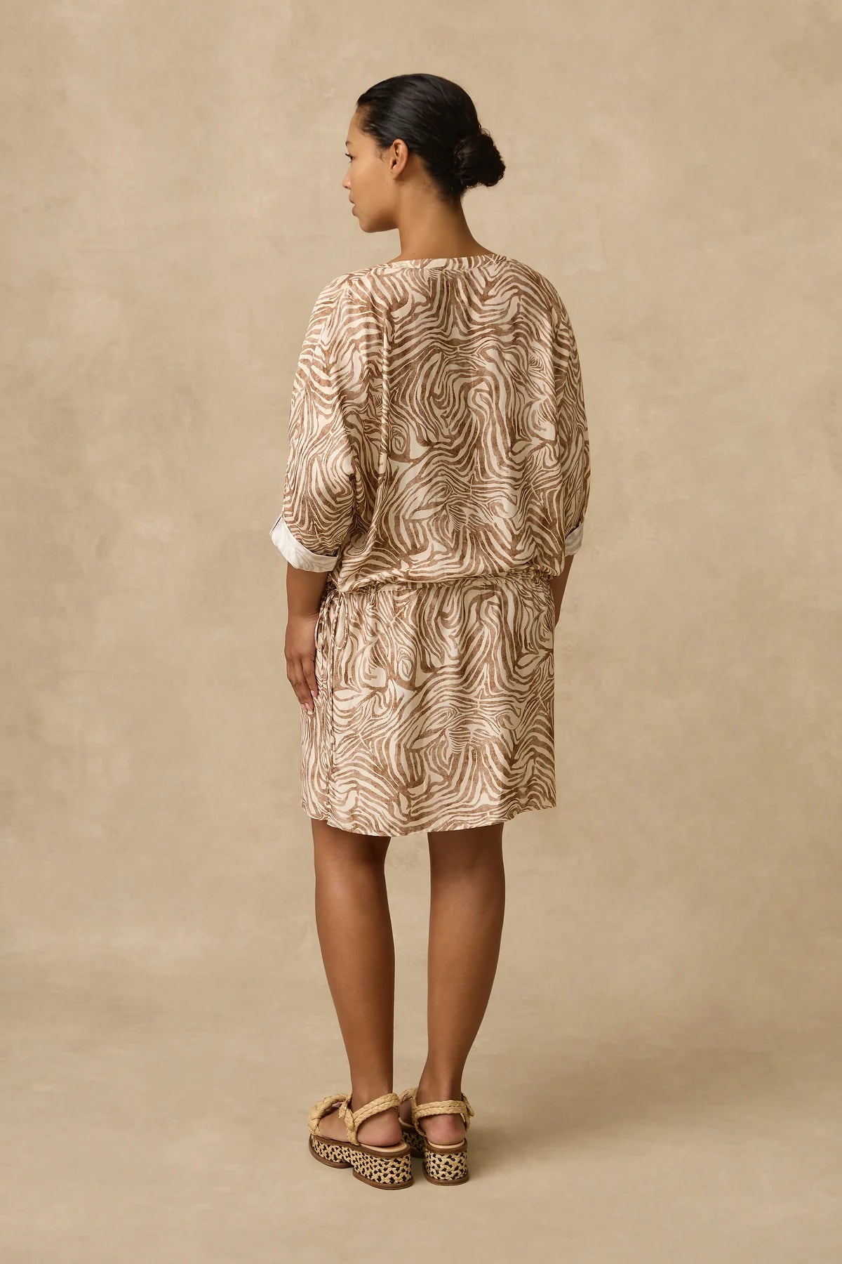 The Nova 3/4 Sleeve Shirt Dress showcases a front button placket and rolled 3/4 sleeves, complemented by a delicate rouleau casing at the hipline that allows you to customize the length for a perfect fit.