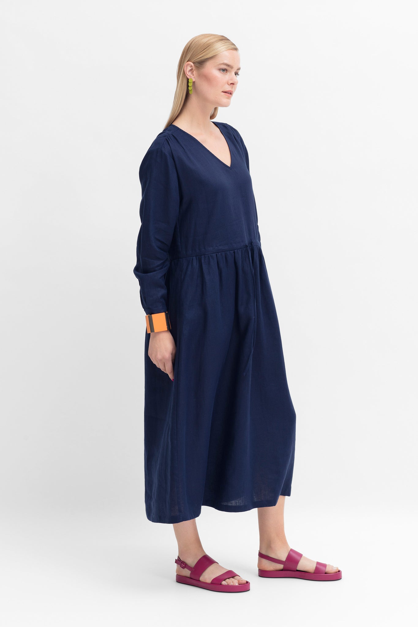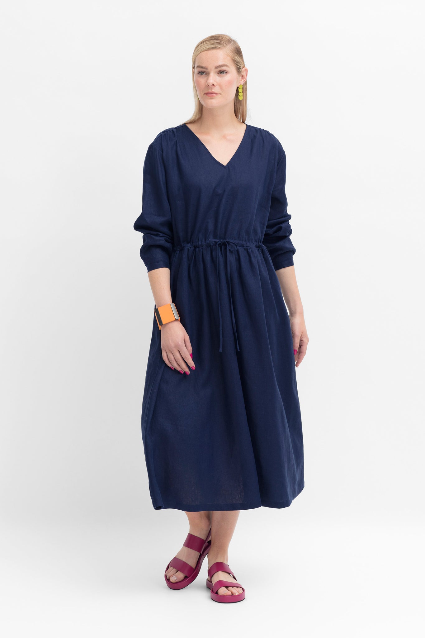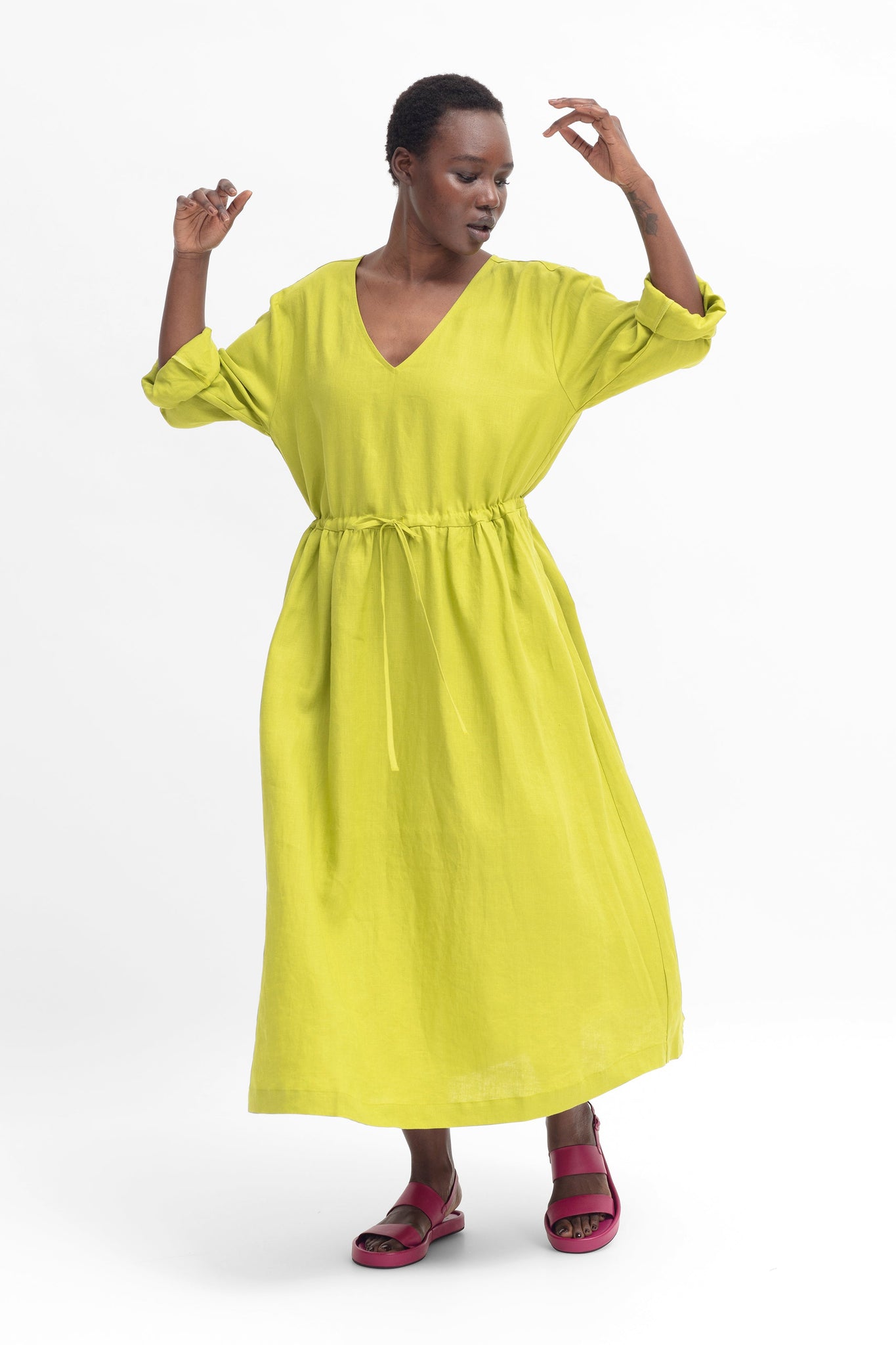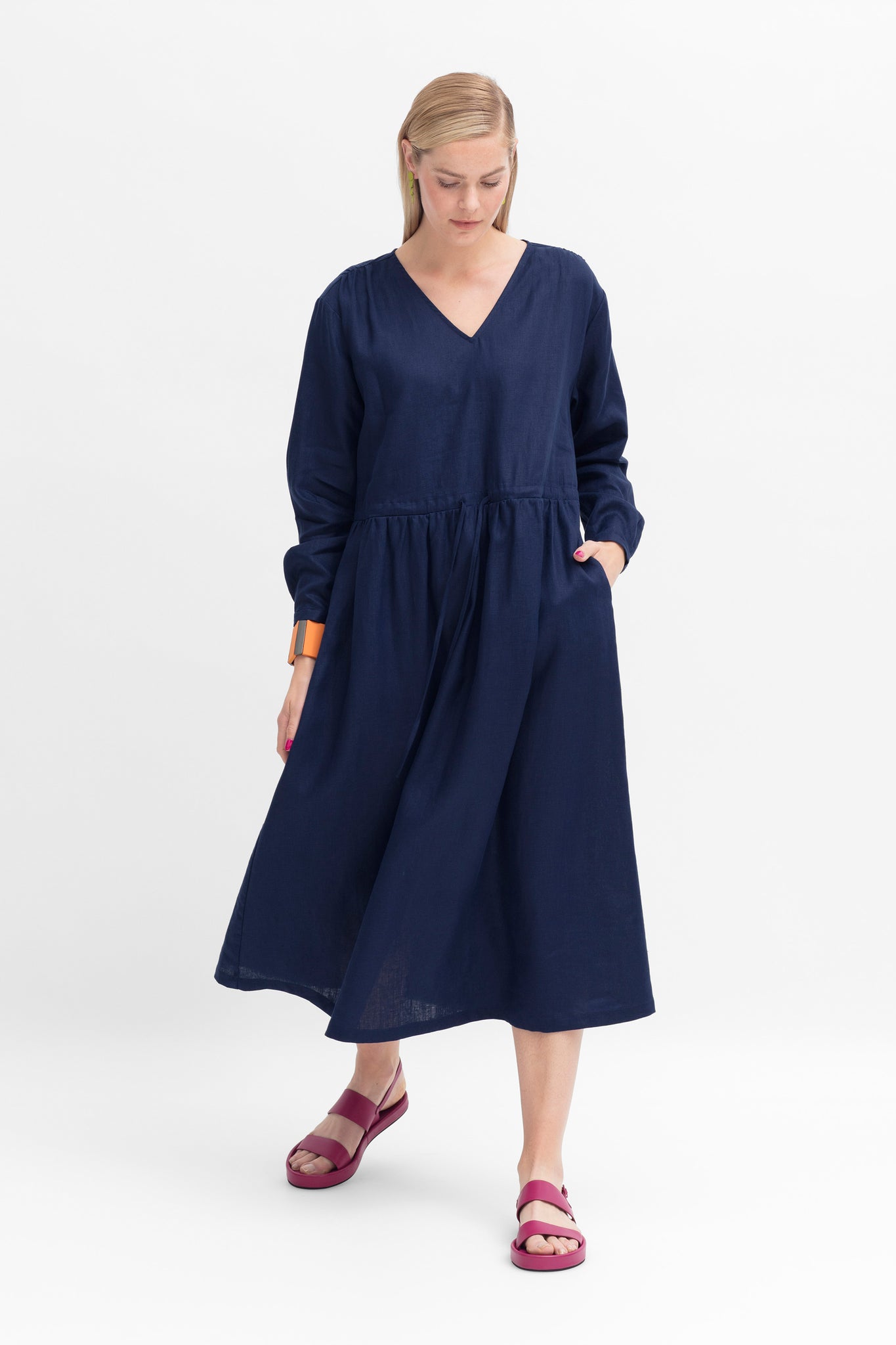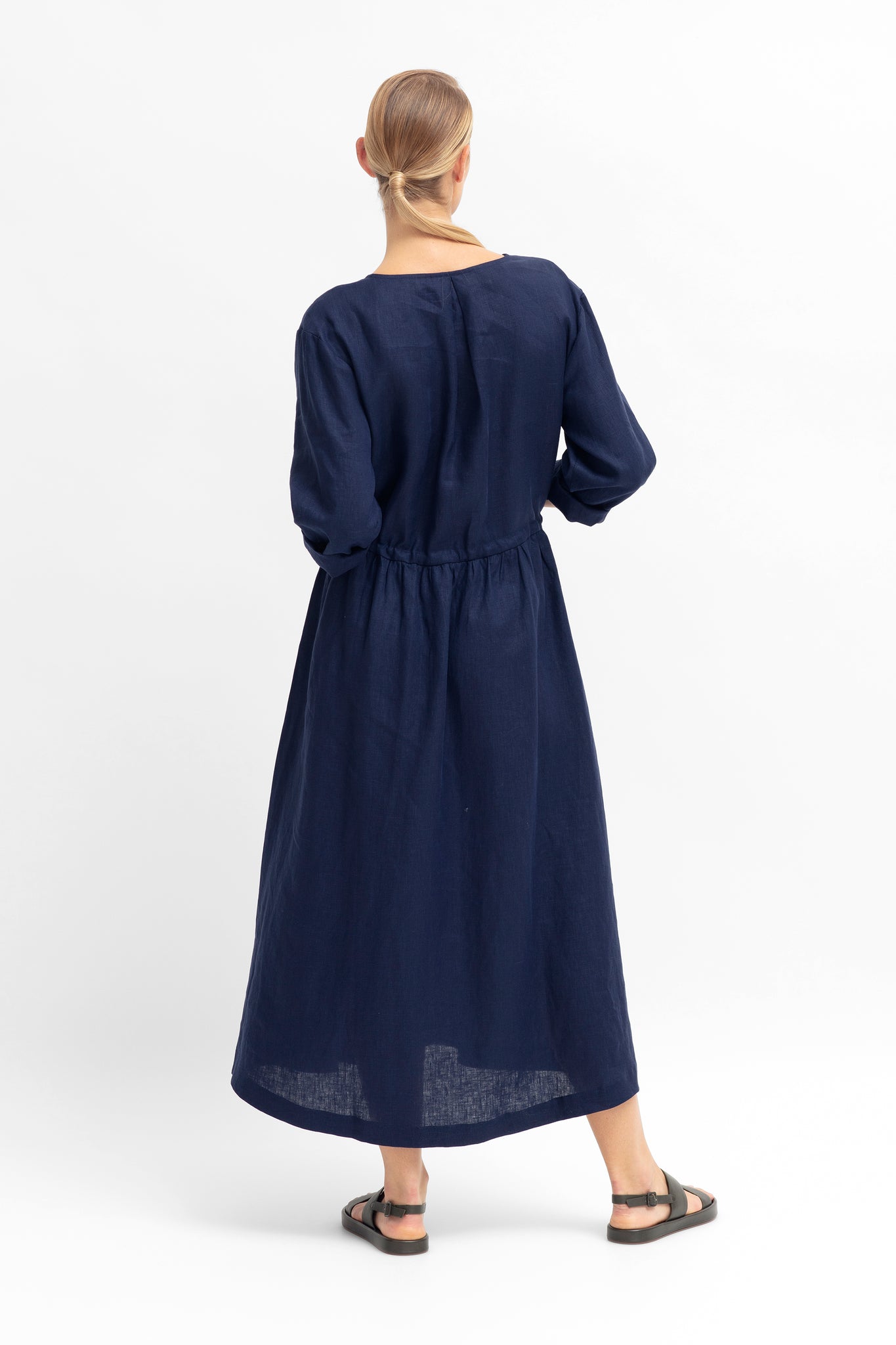 100% French linen Mid to long length with full-length sleeve Can we worn comfortably with a jacket Side pockets The perfect day dress
