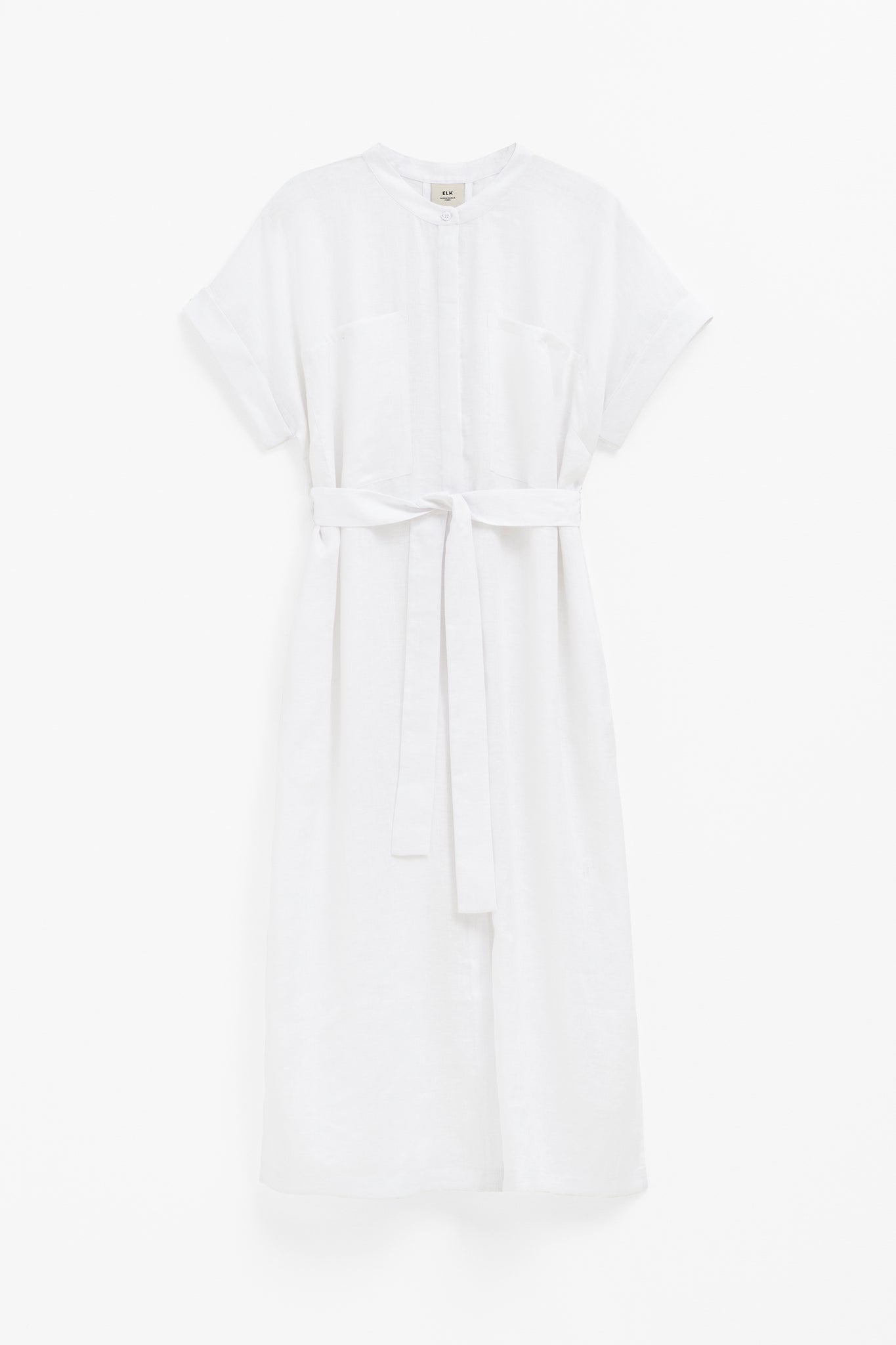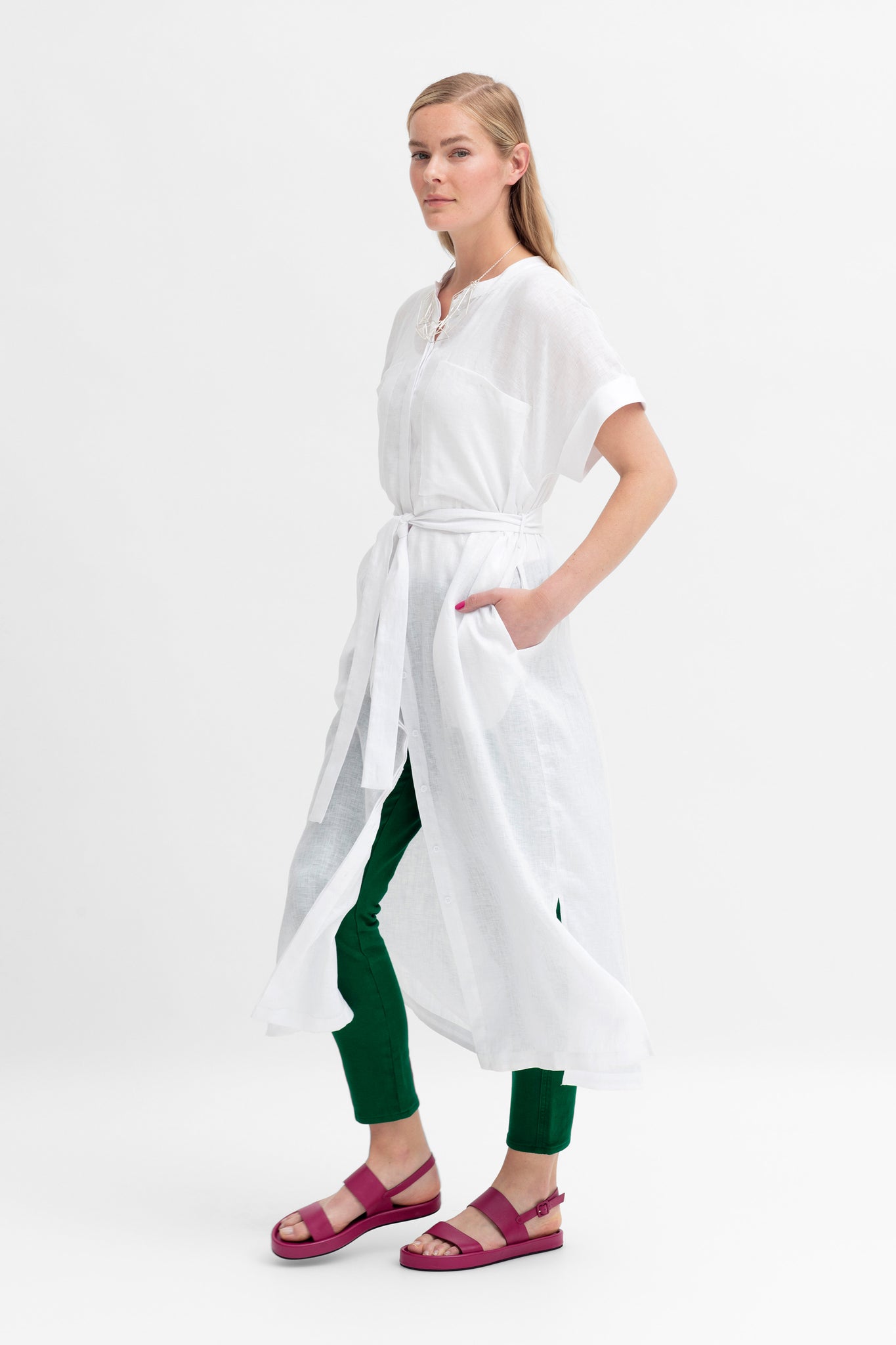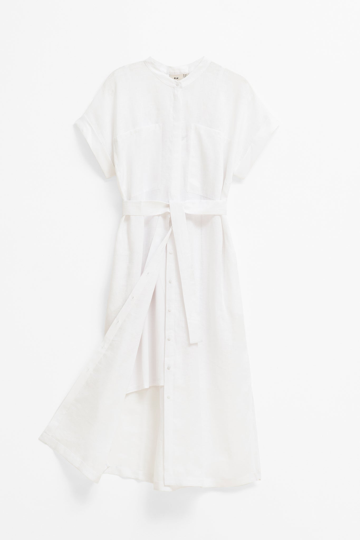 Lightweight French linen Natural Corozo nut buttons Collarless style shirt dress with patch pockets Comes with jersey slip (white on white, contrast colours on others) Wear as a dress or as a long shirt over jeans Comes with sash belt