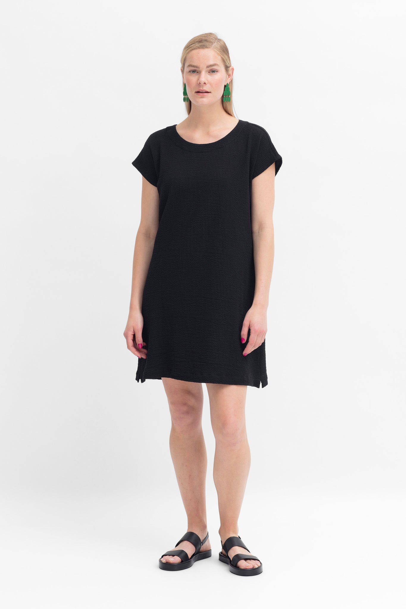 Made from textured, woven, Organic Cotton Shift style dress shape Comes with accompanying sash belt Inverted pleat at the back for easy fit