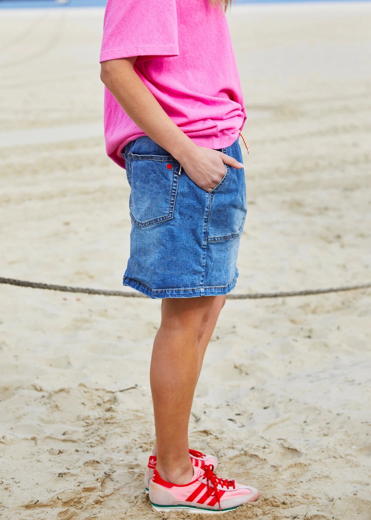 New Hammill & Co stretch  denim skirt in slightly distressed stonewash denim. Elastic waist, orange multi draw cord, front scoop pockets, back patch pockets with our red heart embroidery on the back left pocket.