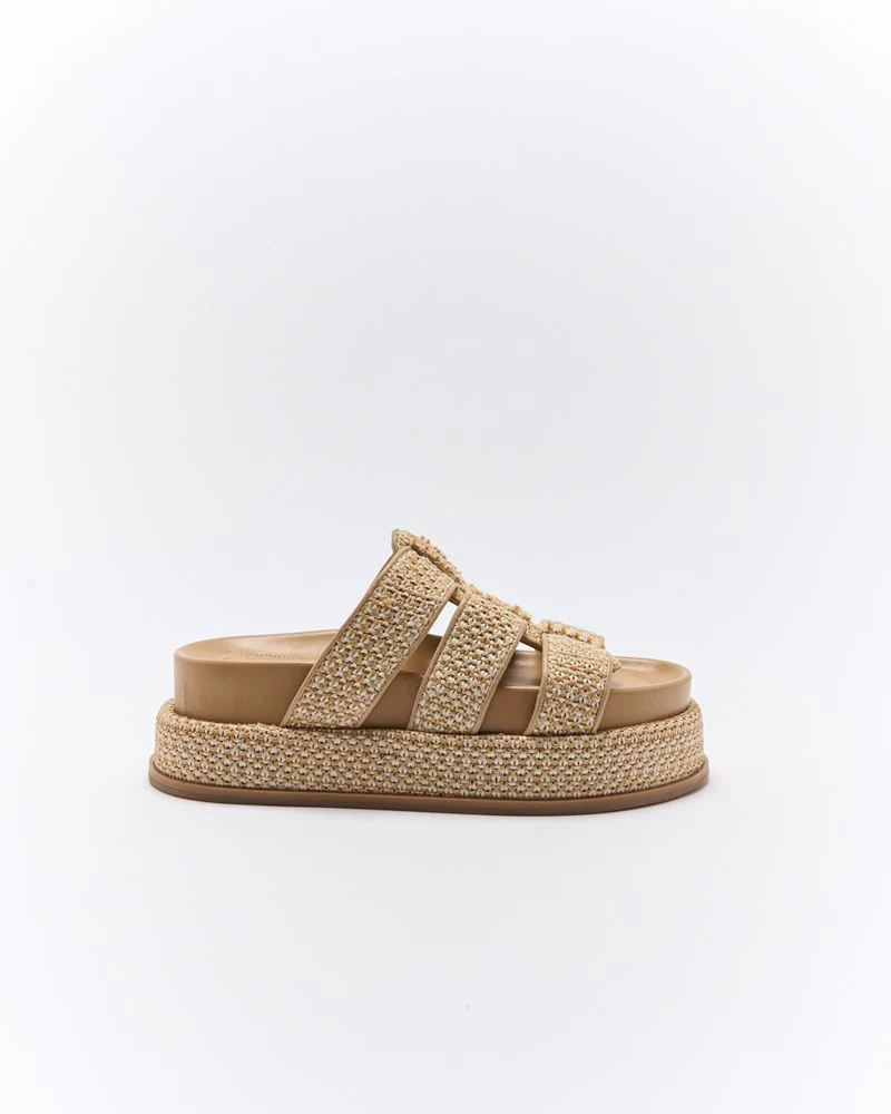 Bold yet effortless, the Huxley Slide features a chunky platform sole wrapped in woven jute for a natural, textured finish. Triple straps offer structure and support, while the padded insole ensures comfort with every step. Available in Natural Multi and Black Multi