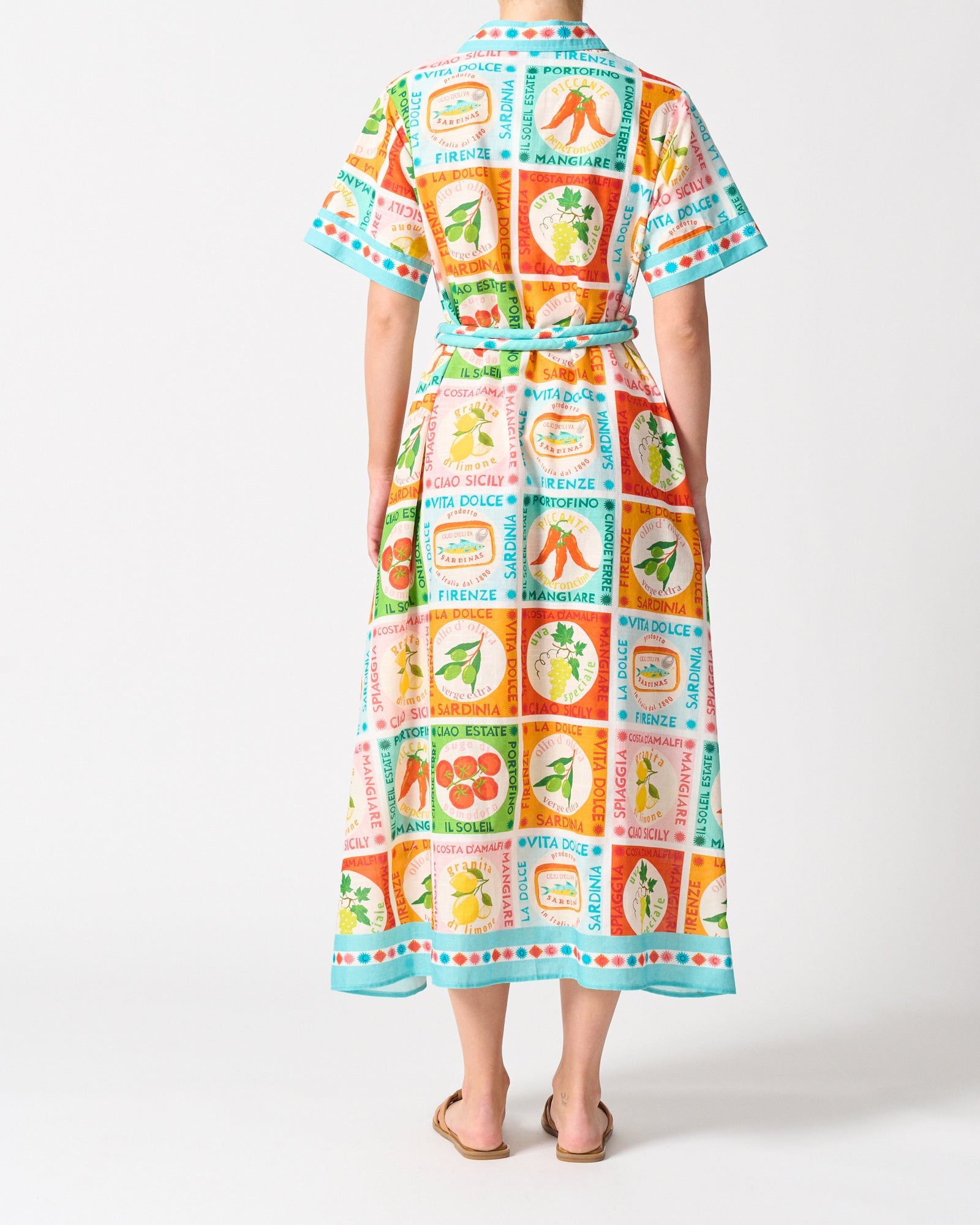 A vacation-ready statement piece, the Cannes Dress in Ciao Sicily is a playful ode to la dolce vita. Featuring an all-over nostalgic Italian print with vibrant motifs and sun-soaked colors, this button-up midi dress is both bold and breezy. The short sleeves and collared neckline bring a relaxed polish, while the removable waist tie lets you cinch it in or wear it loose.
