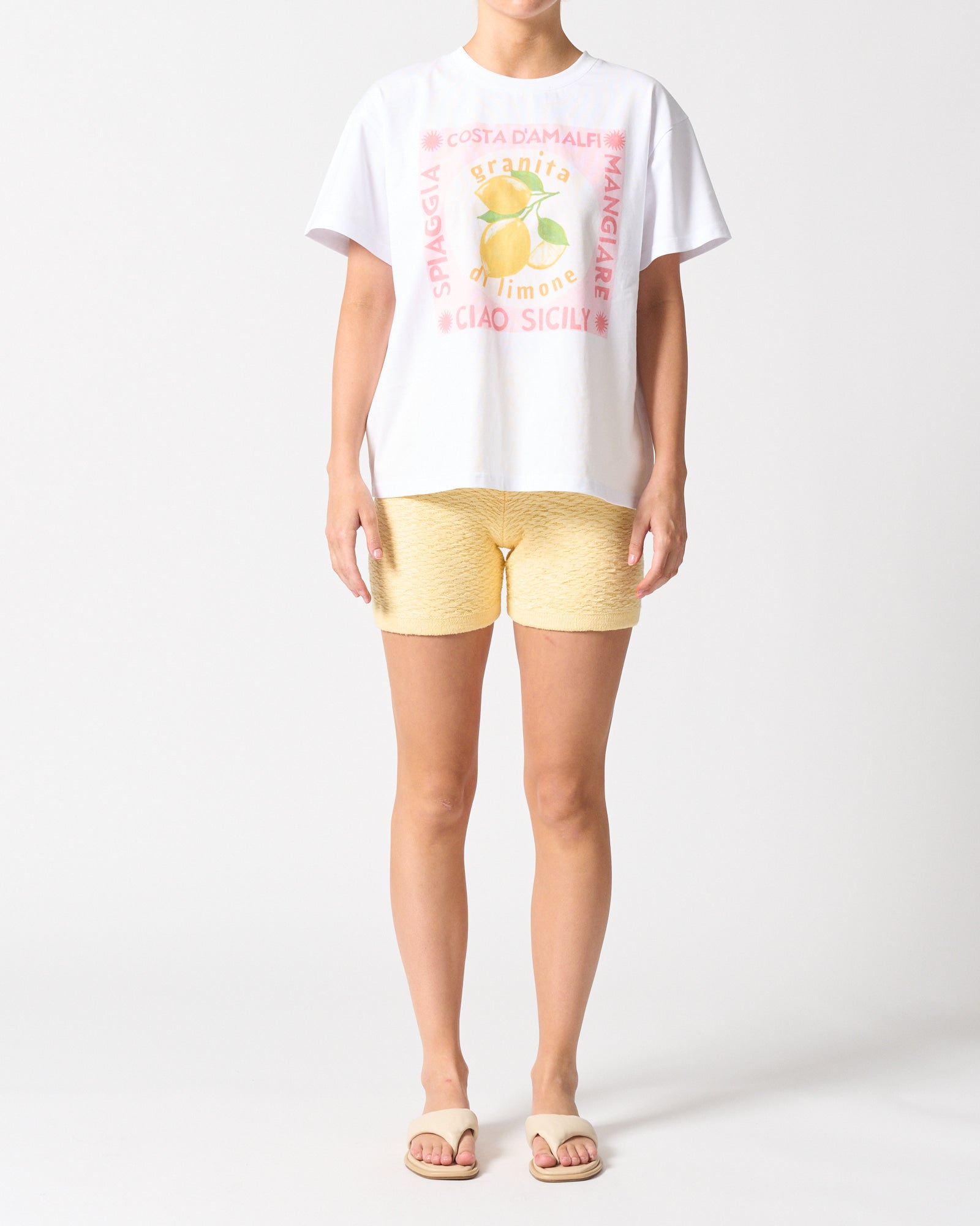 Say hello to endless summer with the Lison tee in Ciao Sicily. Featuring a soft lemon granita print and pastel-toned typography, this tee is a nod to Italy’s sweet rituals. Easy to wear, easy to love—just like your go-to gelato.